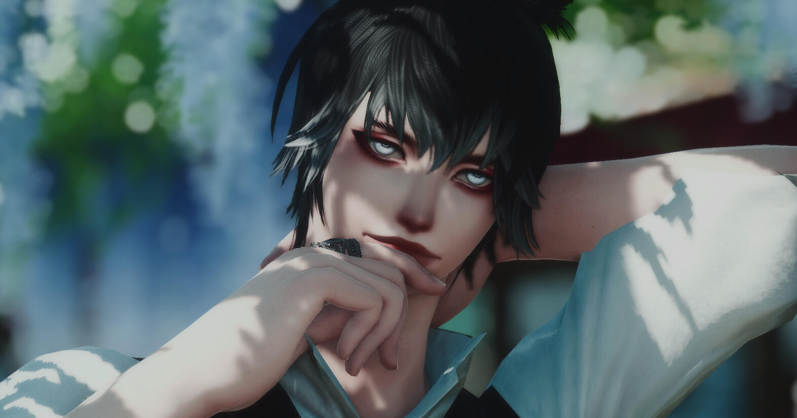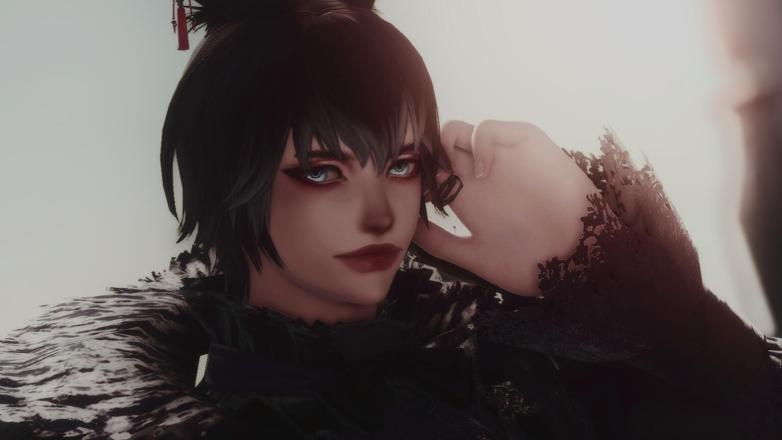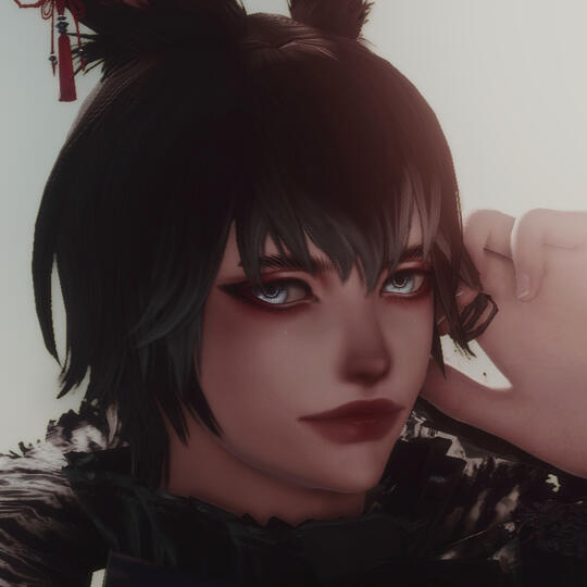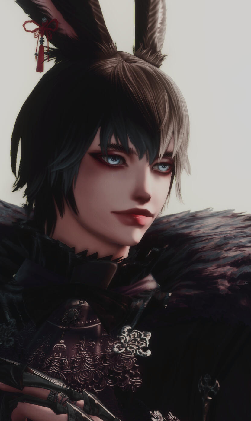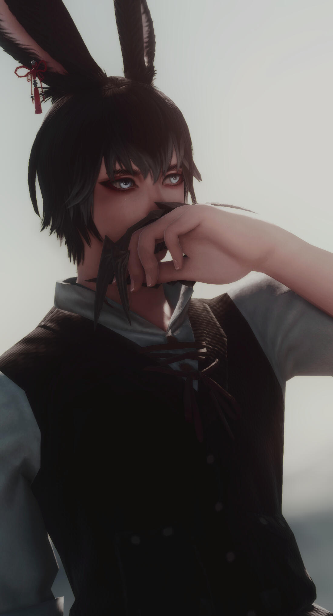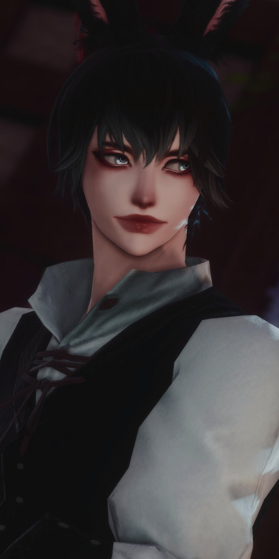 pale eyes and dark hair. a lazy, wicked curl to the curve of his mouth. messy bangs that fall into icy eyes and long, sleek ears. red marking the inner and outer corners of his eyes; a single crimson mole 'neath the tail end of his left eye. long and lean and languid; artfully graceless and constantly appearing to be half-asleep: slender fingertips hiding a soft yawn, gaze half-lidded and almost always faintly amused, and shoulders that always seek to lean on something firm.has a soft, fluffy tail that unabashedly mirrors his emotions. likes to tease and be teased, fond indulgence touching at the curve of his lips and echoed in his exhales.speaks with a slightly accented drawl, voice low and sleep-roughed. prone to using endearments rather than names; all crooked half-smiles and fleeting glances. loves slow-moving mornings; loves the way the ship rocks beneath his hands.